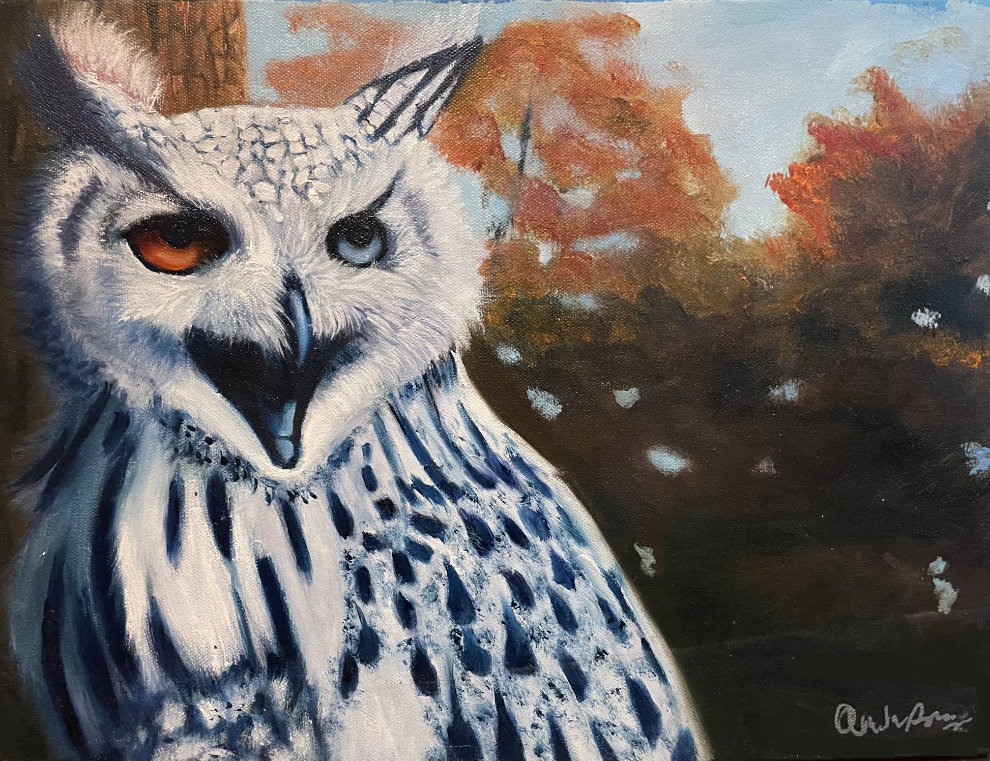 A captivating painting of a white barn owl features its snowy feathers and watchful eyes, evoking a sense of quiet mystery and nocturnal grace.