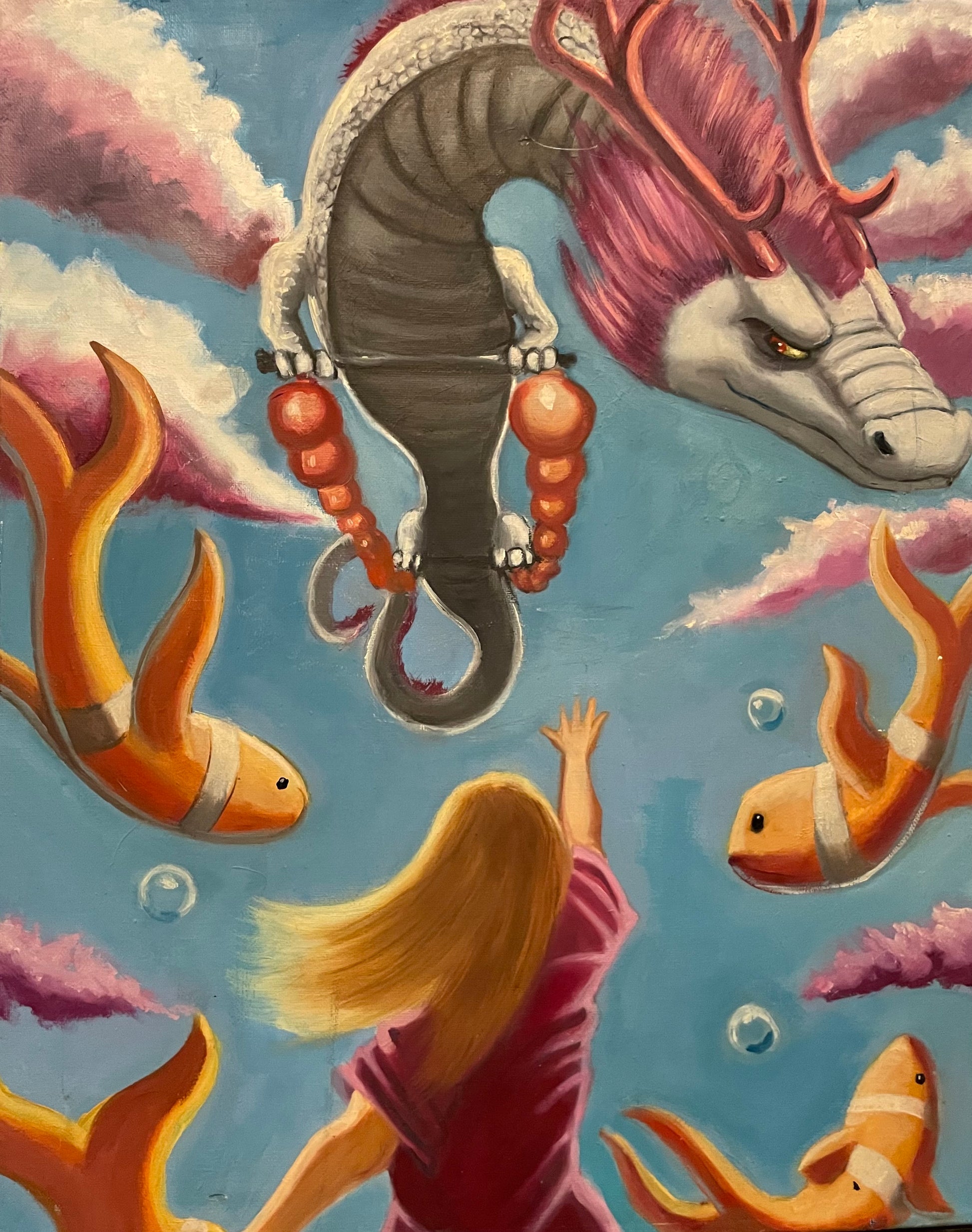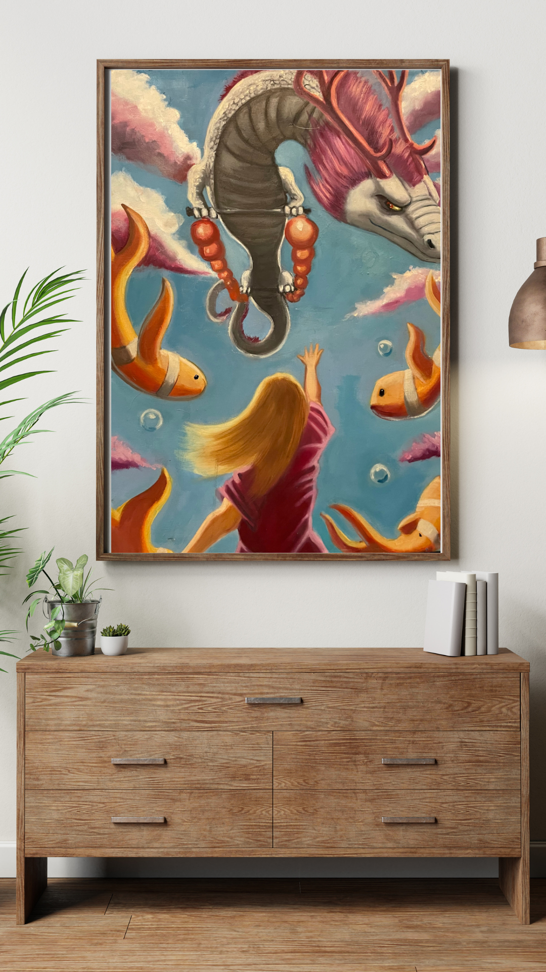 From behind, the child stood small against the vast sky, gazing upward in awe as a dragon and a school of flying fish soared above—an unspoken promise that wonder still ruled the world.