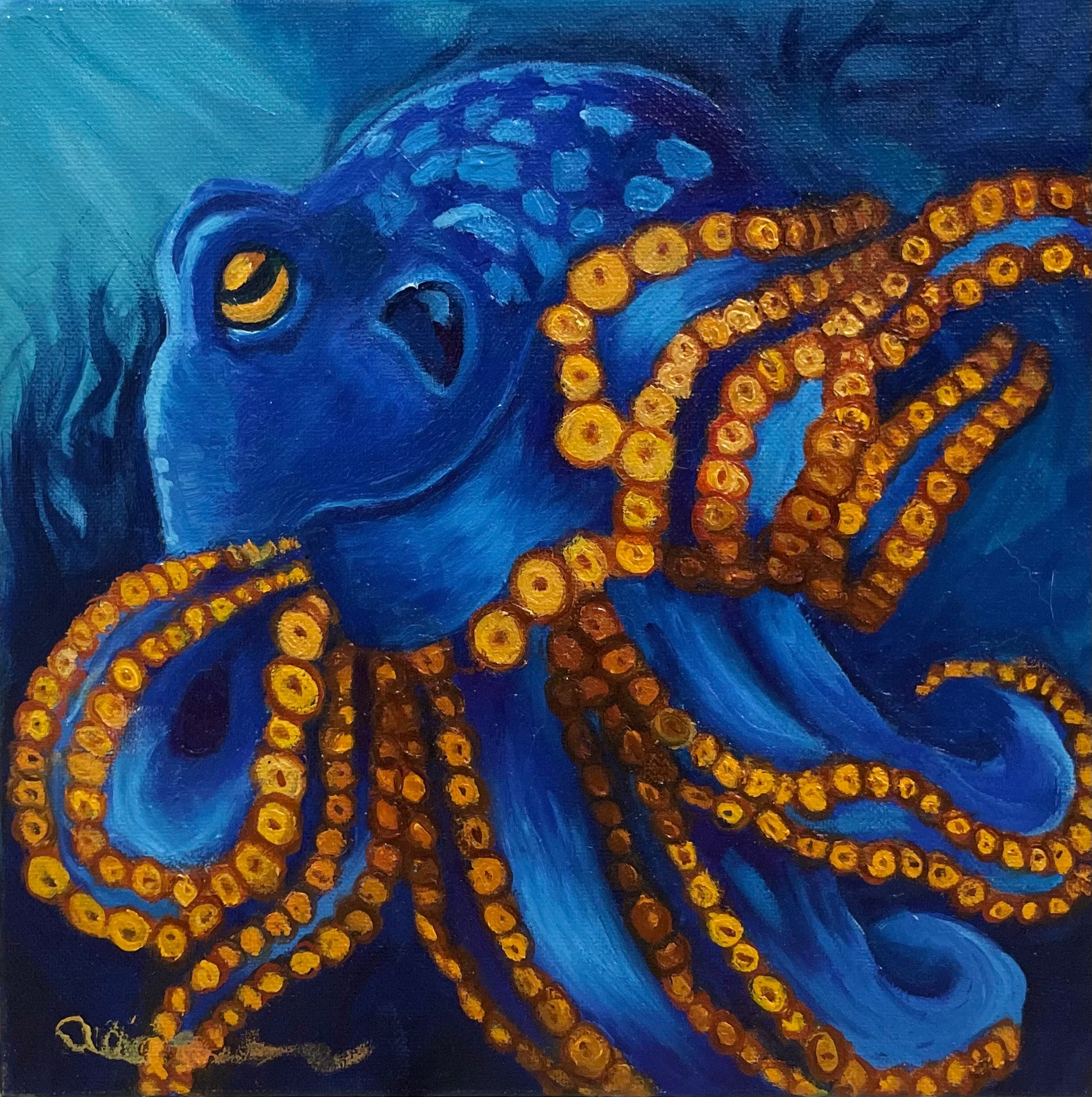A stunning painting of a blue and gold octopus swirls with fluid motion and shimmering color, capturing the creature's elegance and oceanic mystique.