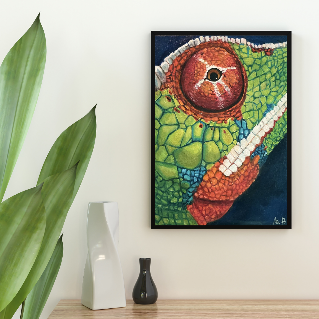 A close-up painting of a chameleon reveals its intricate scales and mesmerizing eye, capturing the creature’s vivid colors and quiet, watchful intensity.