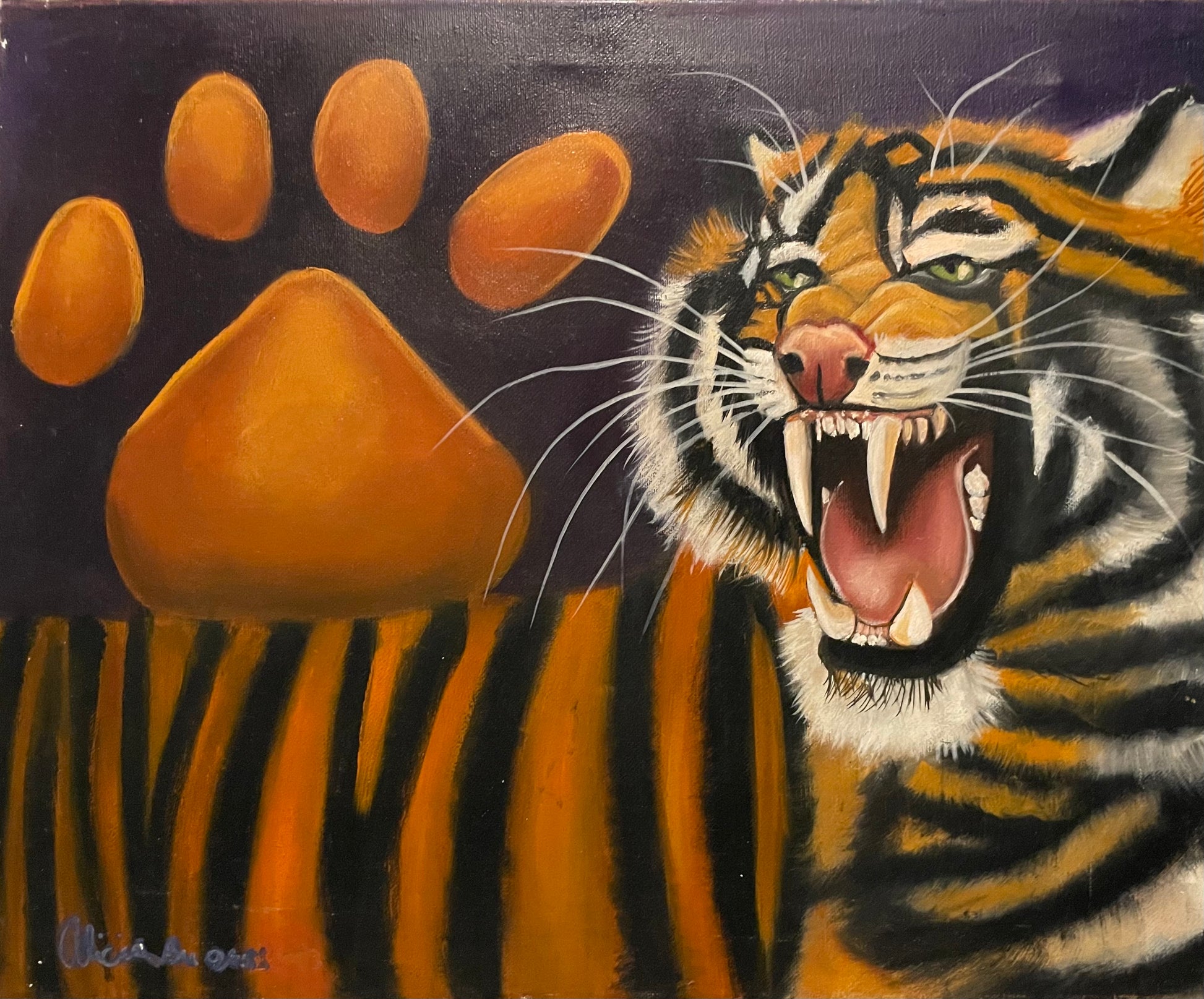 A bold painting of a tiger commands the foreground with intense focus, while the iconic Clemson Tiger Paw in the background adds a spirited tribute to school pride and power.