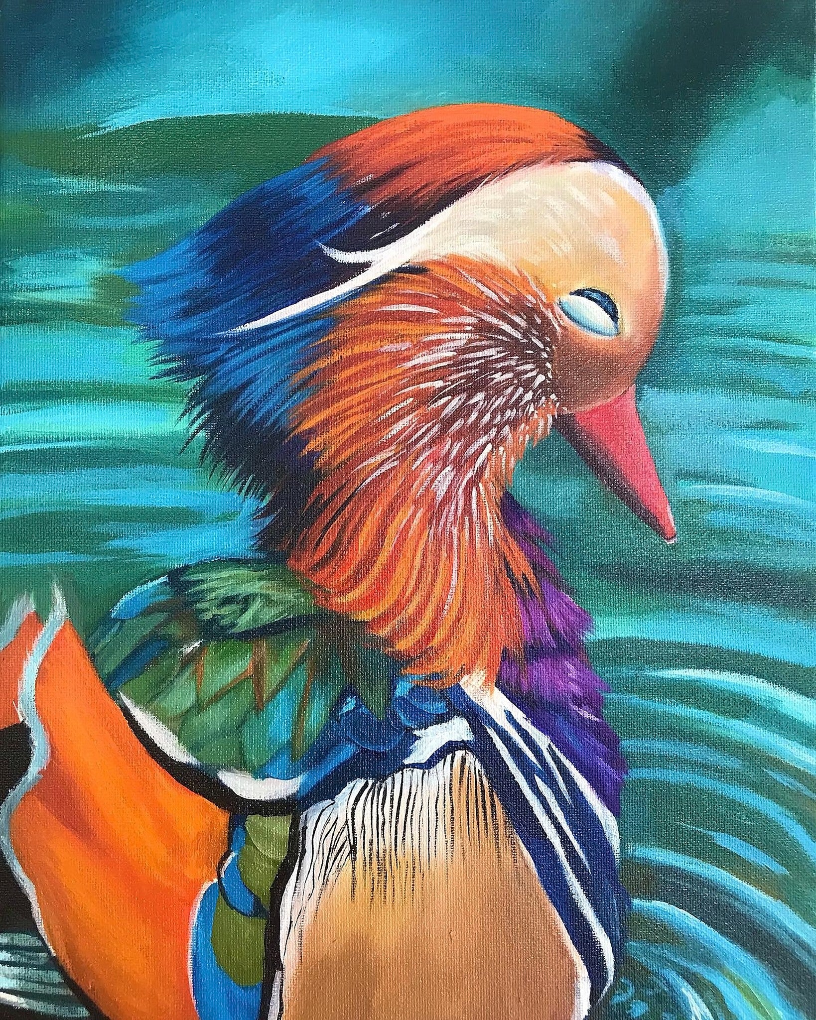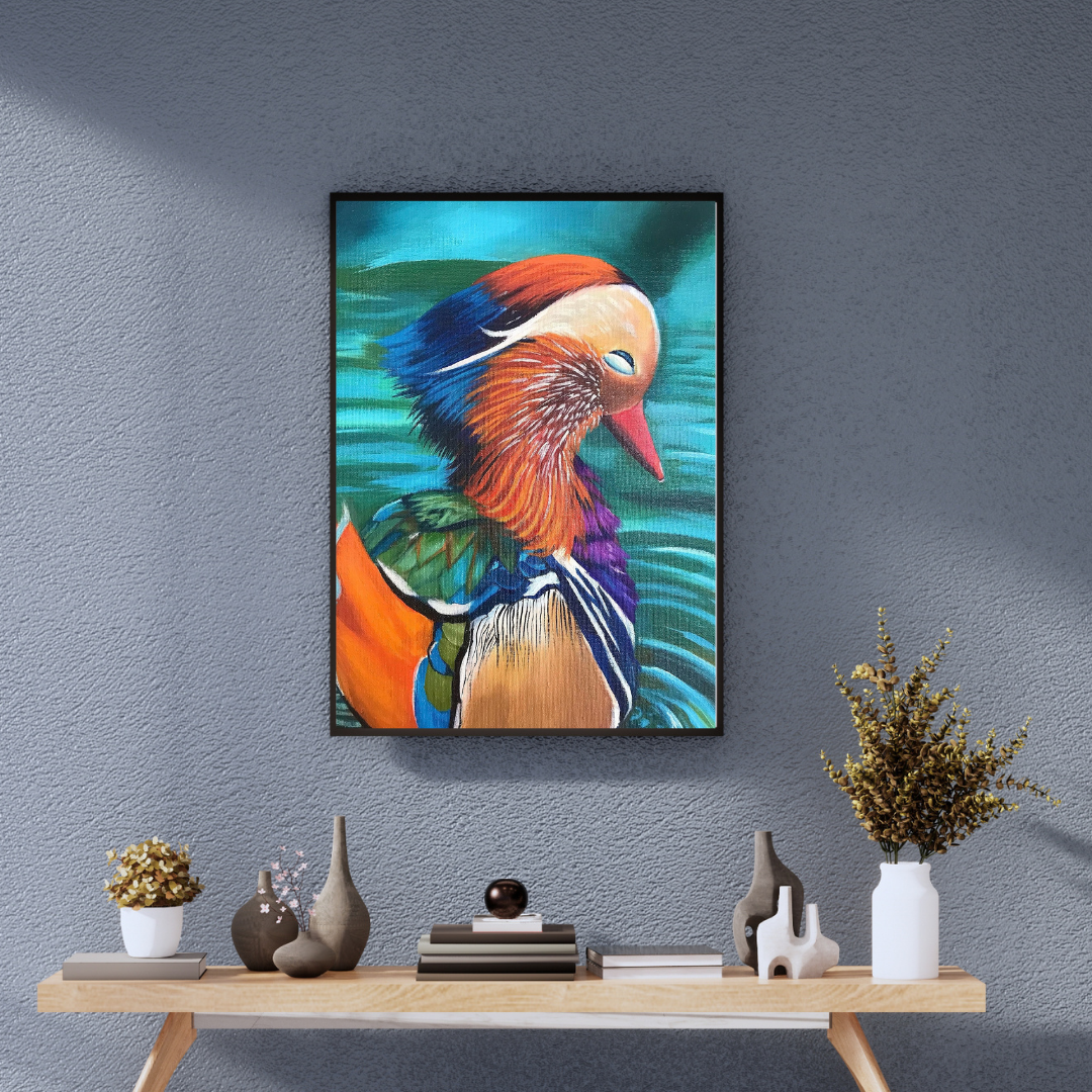 A stunning mandarin duck painting showcases the bird’s dazzling plumage and graceful form, blending vivid colors with serene elegance on canvas.