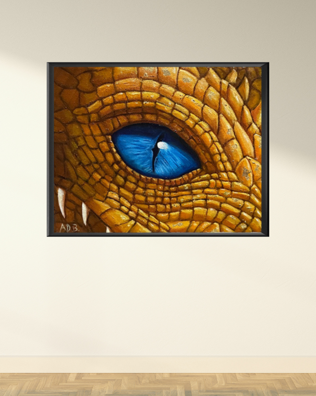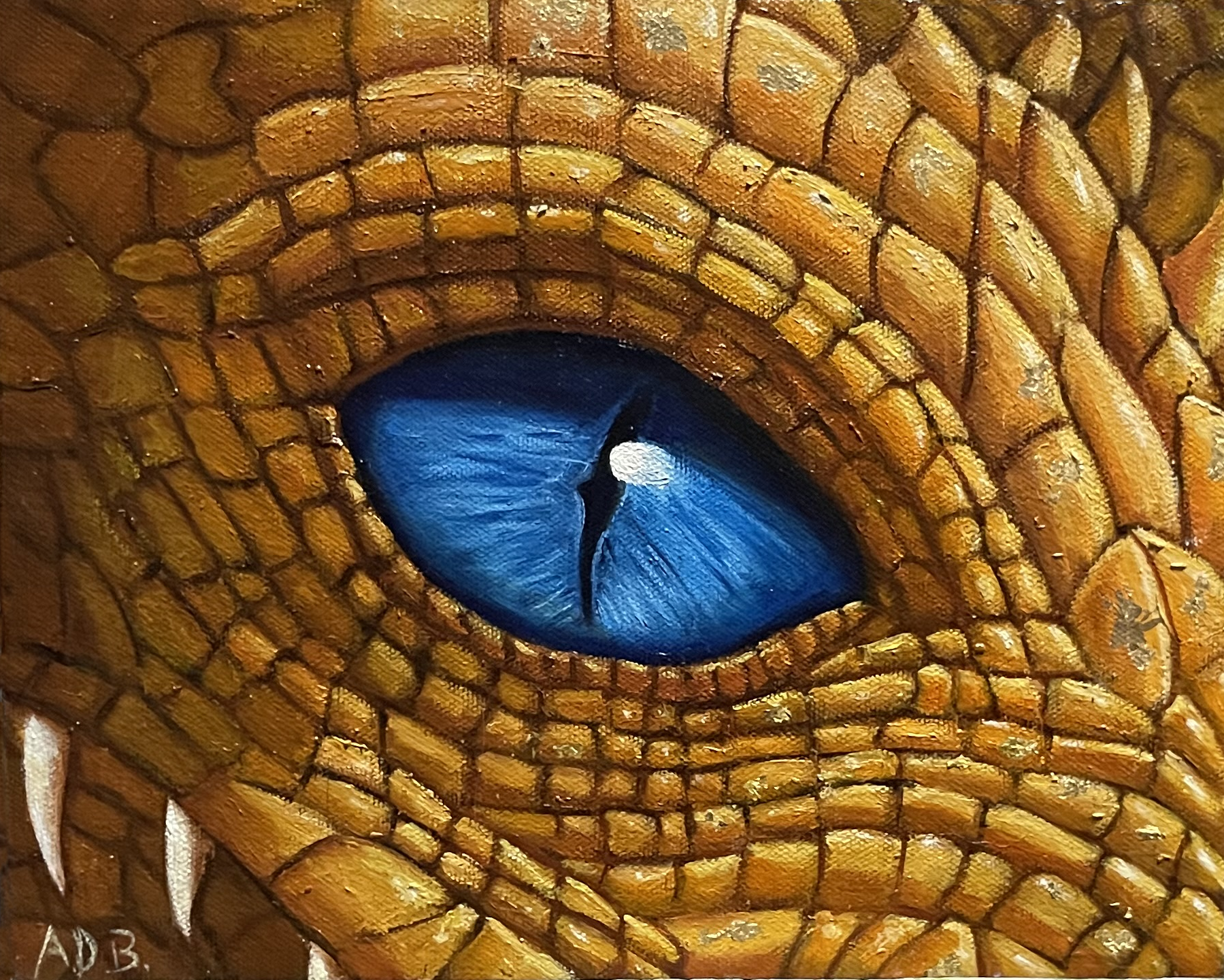 A single blue eye, ancient and unblinking, peers from a tapestry of gold scales, holding the weight of untold secrets and the fierce majesty of a dragon’s soul.