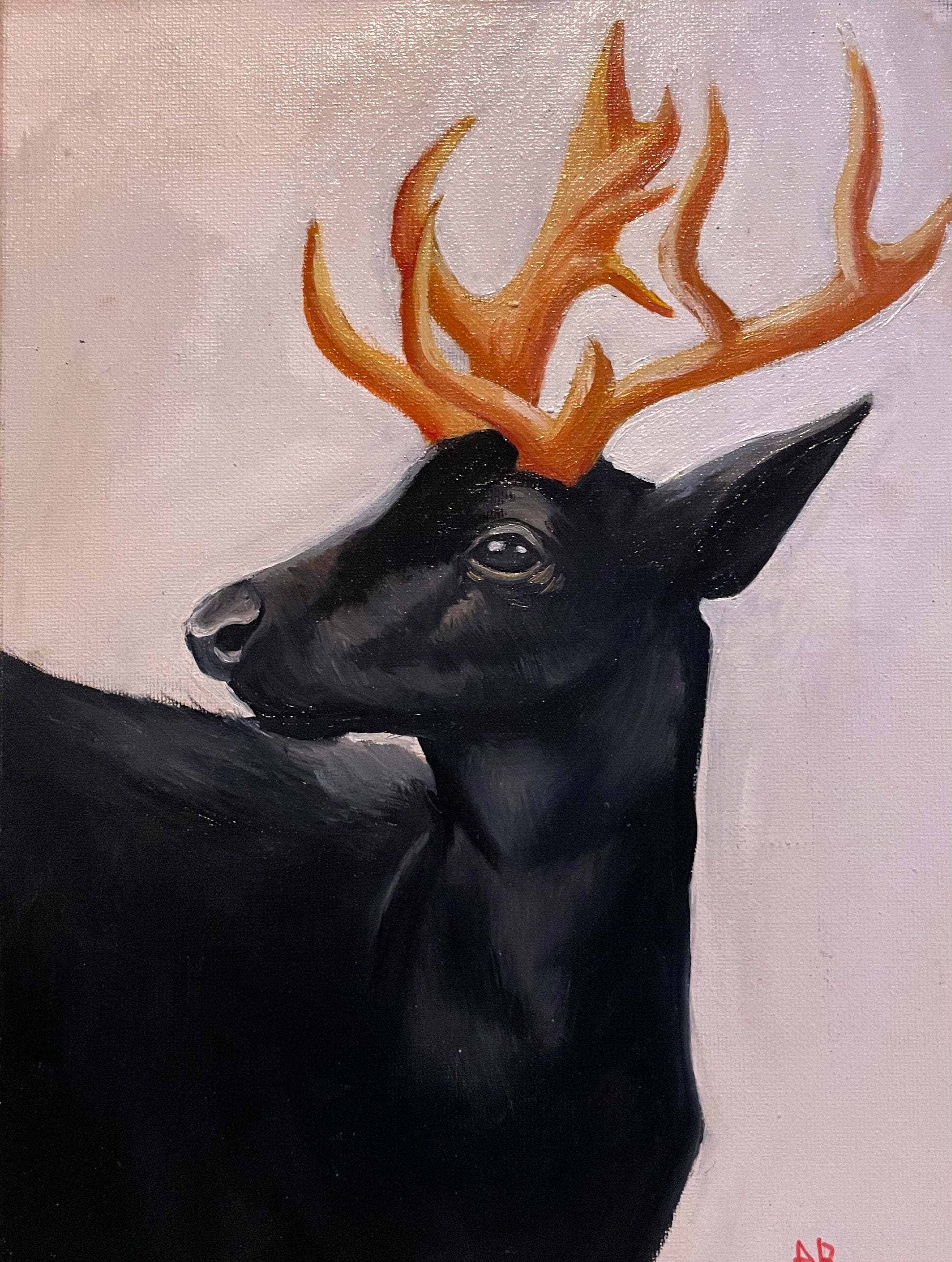 A black stag with gleaming gold antlers stares forward in regal stillness, embodying mysticism, nobility, and the quiet power of contrast.