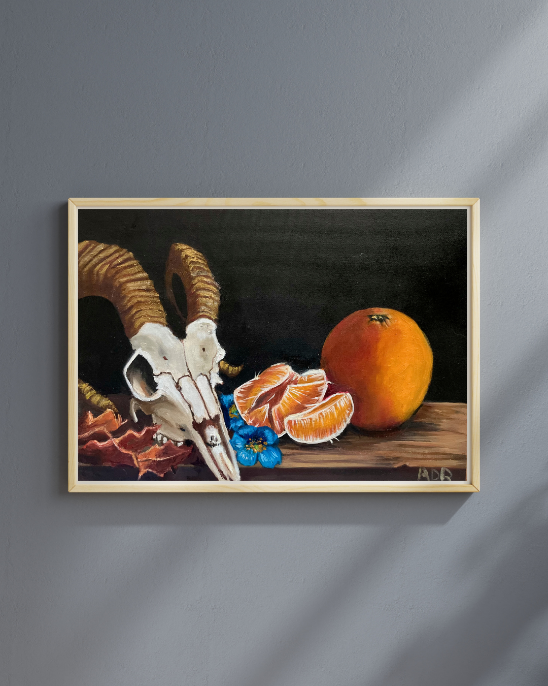 A feast once savored now sits in silence, watched over by the hollow grin of what remains.