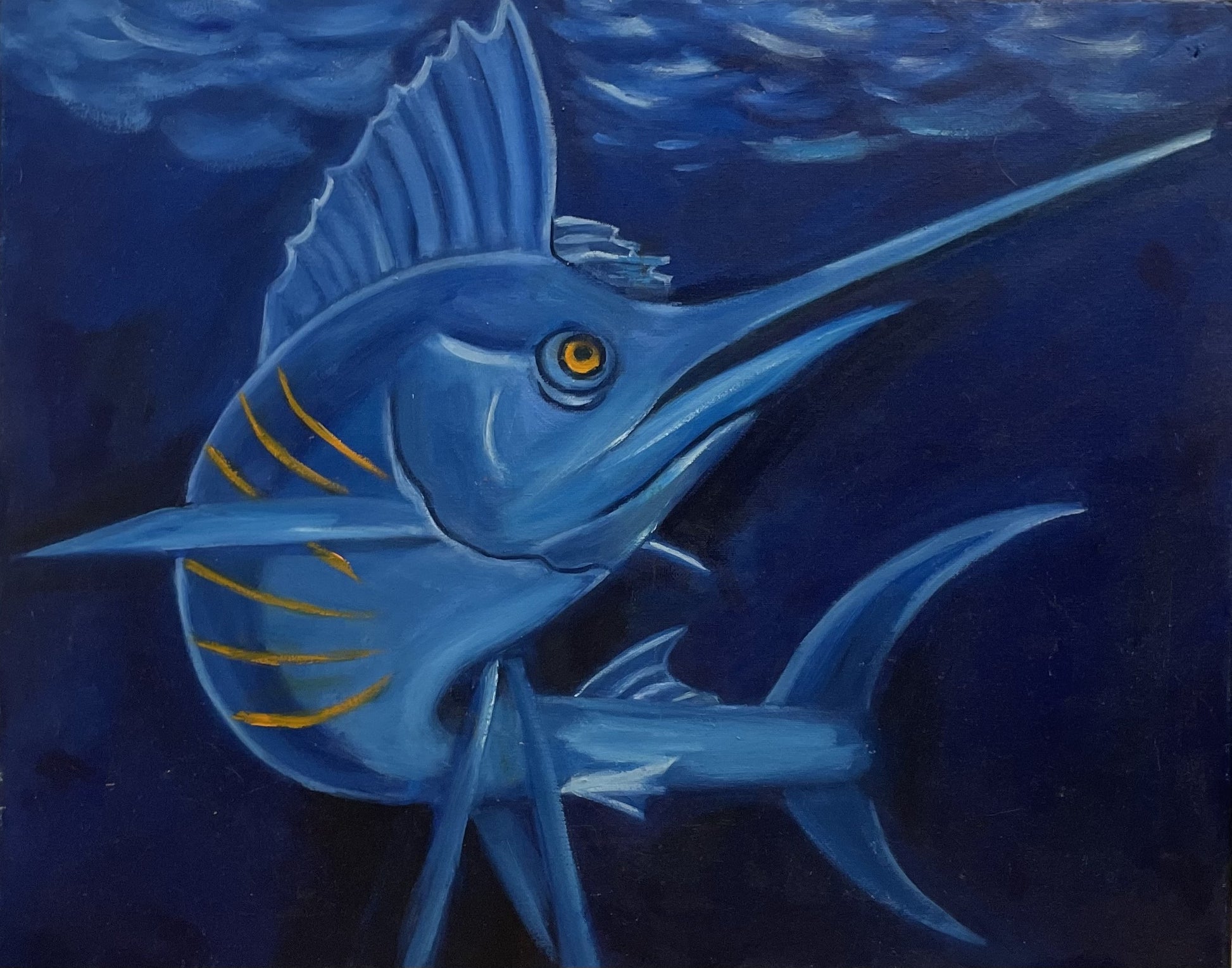 A marlin glides through the depths with effortless power, its streamlined body slicing the water like a living spear in the silent blue.