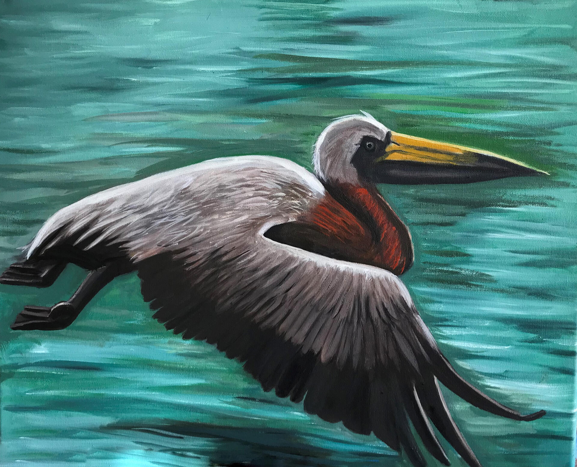 A pelican glides across the marshland, its broad wings skimming the golden reeds below, capturing the quiet grace and untamed spirit of the wetlands.