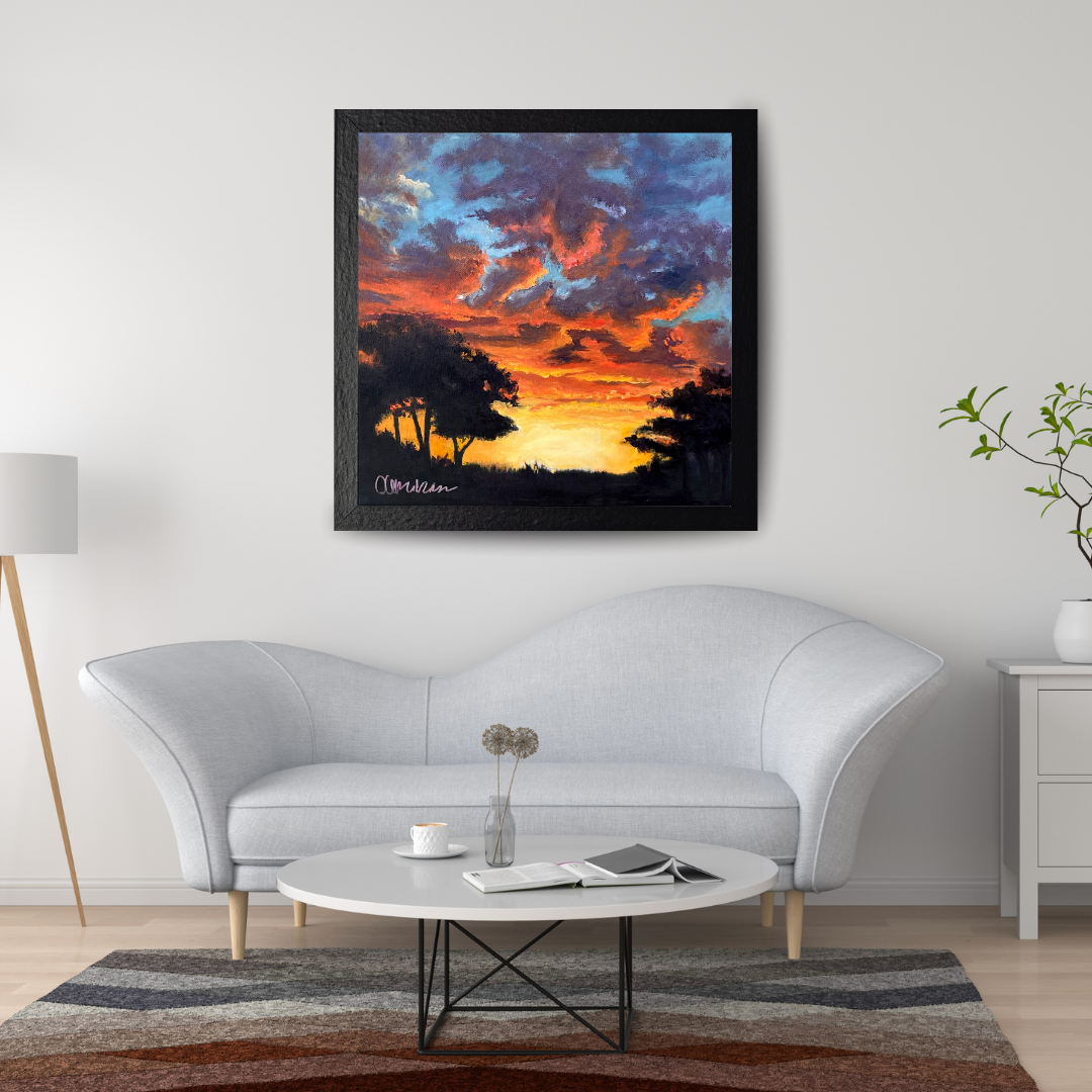 As the sun sinks below the horizon, the sky blazes with hues of fire and gold, casting a final, lingering glow over the world in a moment of quiet magic.