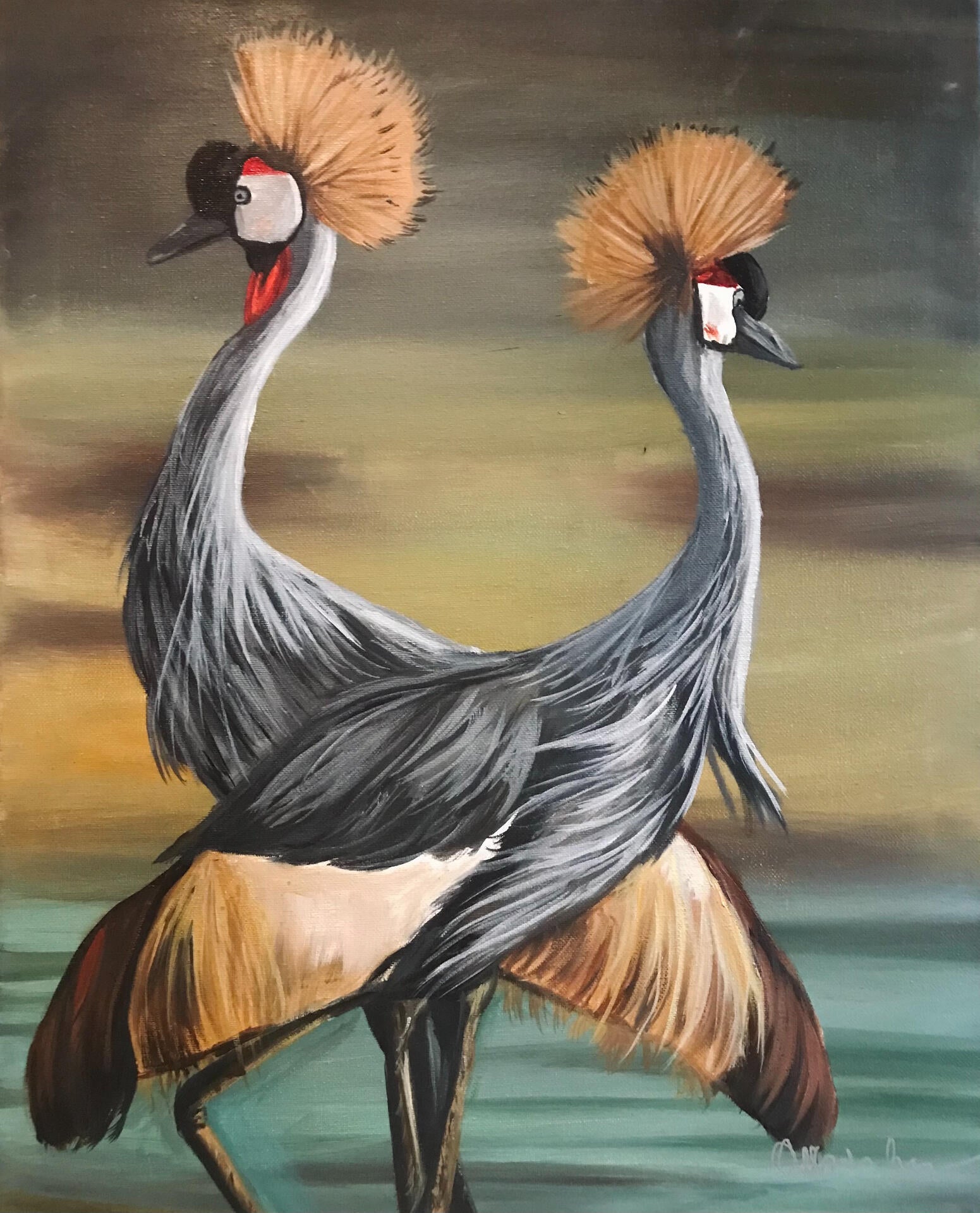 Two elegant cranes stand poised in harmony, their graceful forms symbolizing peace, longevity, and balance against a serene backdrop.